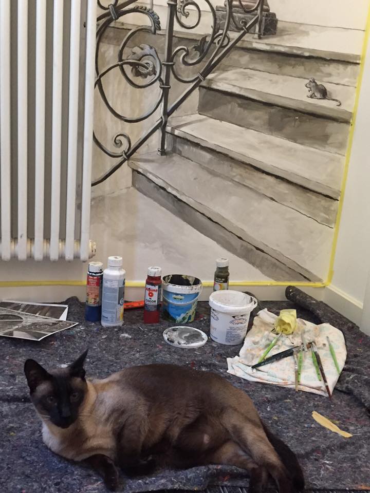 Die Idee war, dem Flur ein zweites Treppenhaus zu geben, das oben auf der Wand aber nicht zuende gemalt wird, um die Wand selbst nicht zu erdrücken.